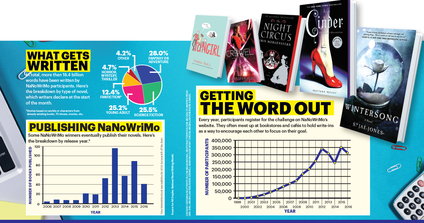 Some NaNoWriMo winners even publish their projects. S. Jae-Jones wrote her first published novel, Wintersong, during NaNoWriMo after struggling with a different book. “I gave myself permission to not care whether Wintersong was good,” she says. As a result, Jae-Jones was able to enjoy writing rather than worry about publishing her book.
