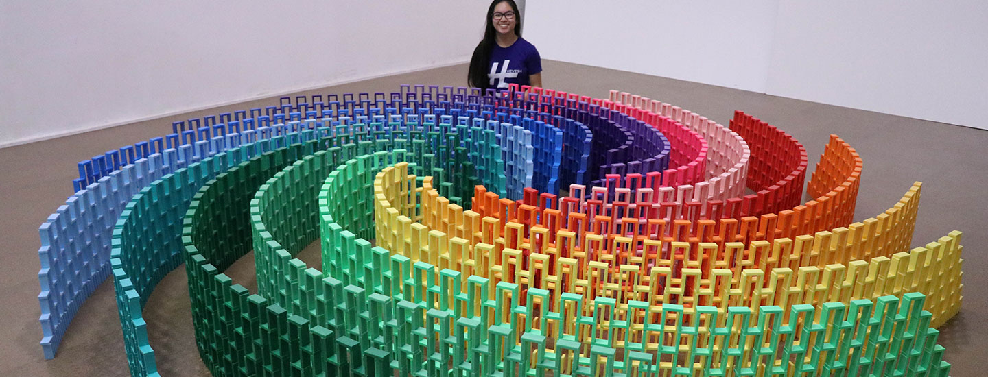 Soon she began searching online for domino videos. She discovered many elaborate domino displays. “I found people building incredible structures, spelling out words, and even making portraits,” she says.