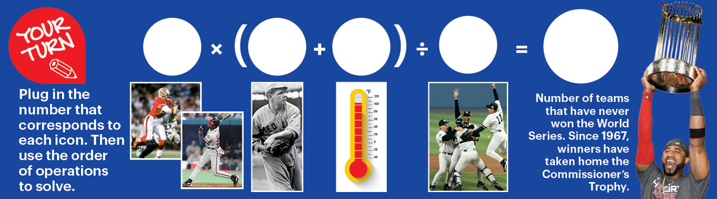 Batter up! For more than 100 years, Americans have gathered (almost) every fall to see which professional baseball team will be crowned best. The competition has been canceled only twice: once for a players’ strike in 1994 and the other in 1904 because of a bitter rivalry when the New York Giants refused to play the Boston Americans. The World Series consists of up to seven games. The first team to win four wins the championship!