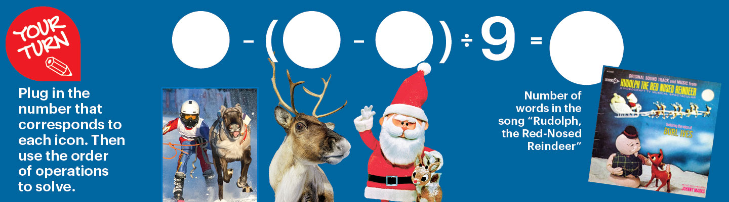 Read on to learn more about Rudolph and actual reindeer. Then plug in the numbers to solve the equation below and reveal a final fact.