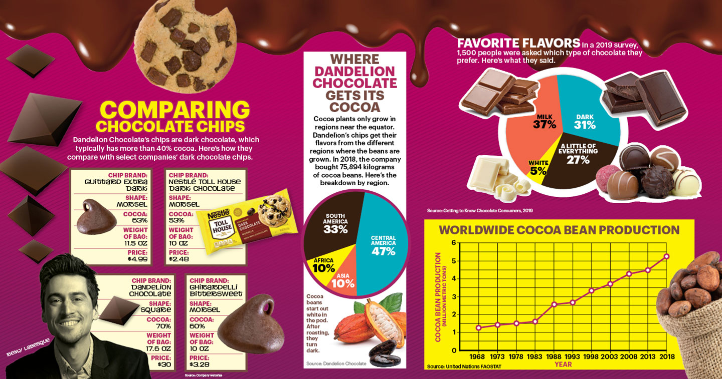 Since Dandelion makes only small batches of chocolate, the chips’ flavor varies depending on the cocoa beans they’re using. Each cocoa-growing region’s bean has a different flavor. “Because the chocolate has such distinct flavors, the bakers are loving it!” says Roy.