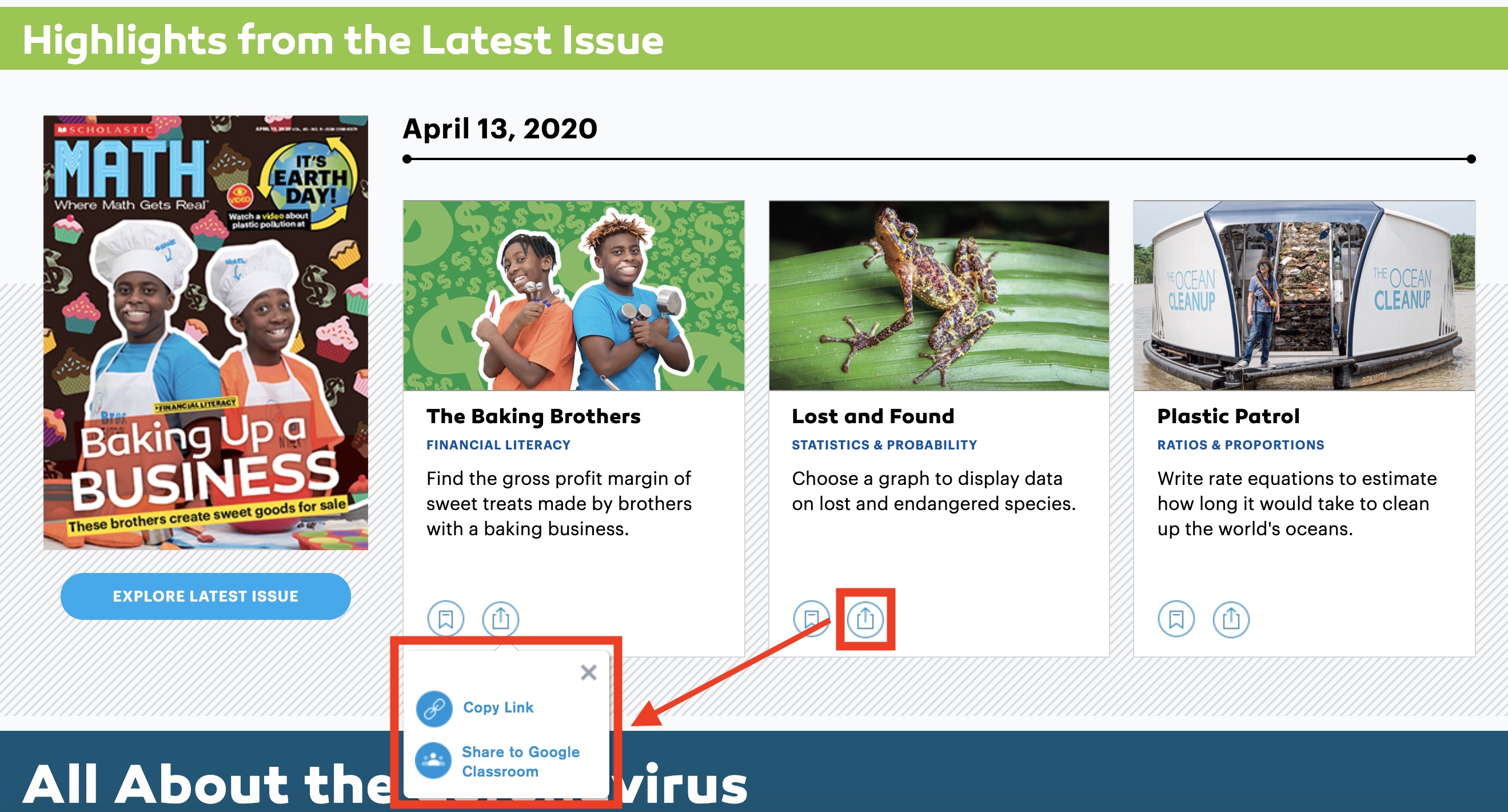 Look for the share icon on articles, issues, videos, or games throughout your website and click “Copy Link” or “Share to Google Classroom.”